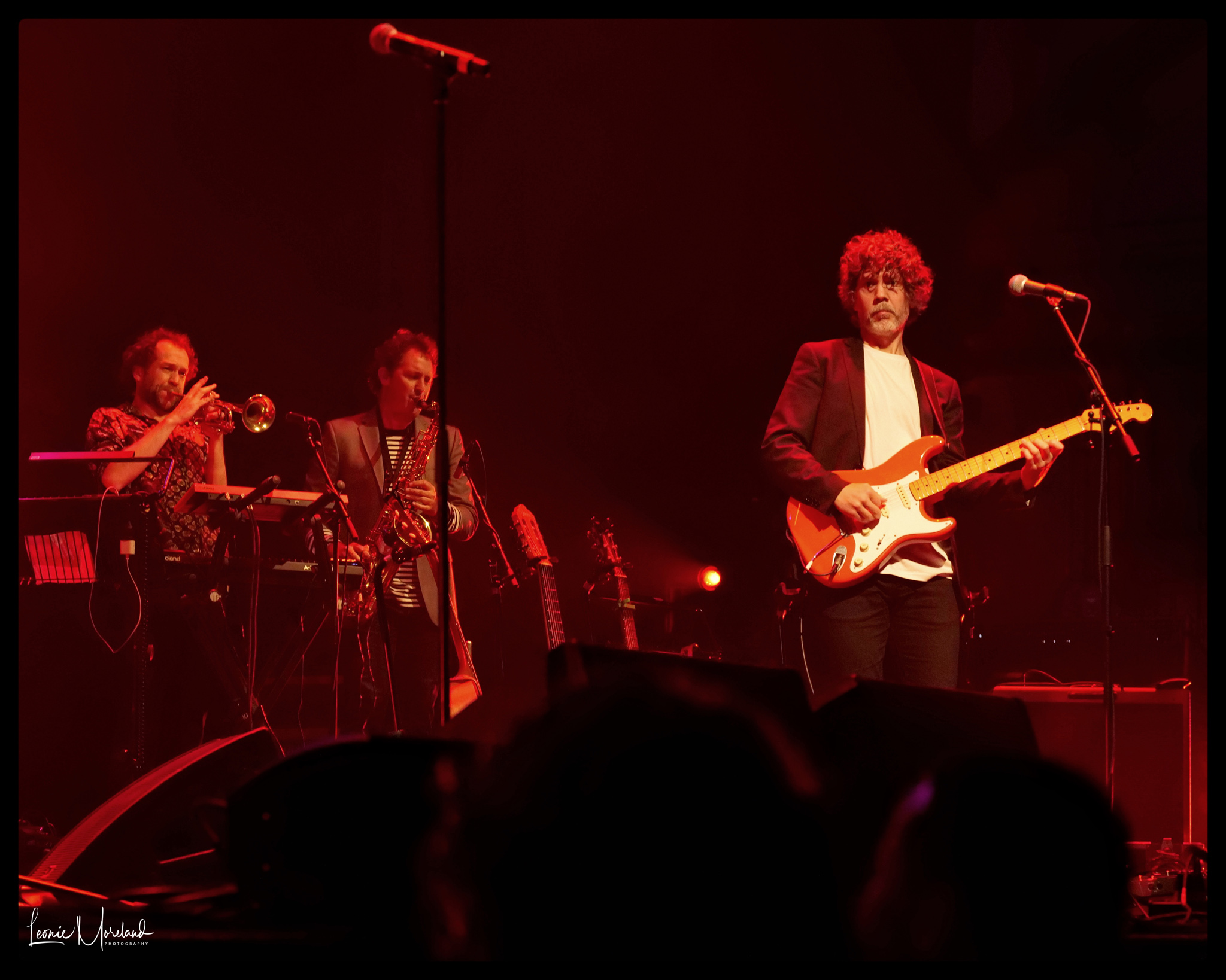 The rest of the Band. Mike Hall bass, Michael Barker and Alistair Deverick drums and percussion, Matthias Jordan keyboards, Finn Scholes trumpet and more, and Nick Atkinson saxophone.