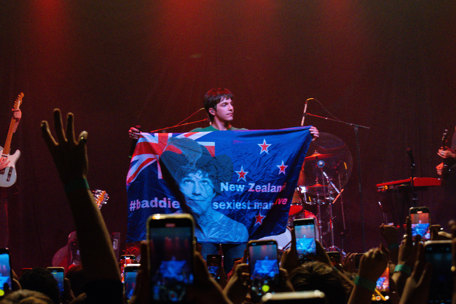 During the final song, he reaches into the crowd where an ecstatic fan hands him a flag emblazoned with his image, the New Zealand flag, and the bold declaration New Zealand’s Sexiest Man Alive. He lifts it high, grinning from ear to ear as the crowd erupts, fully embracing his newfound Kiwi fandom.