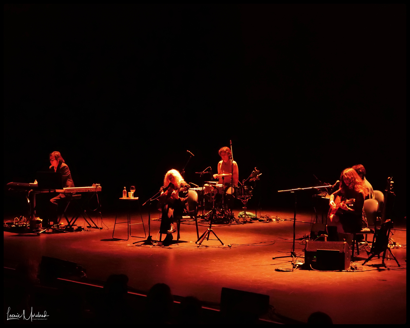 Not the band, with drums, keyboards, electric guitar and bass. The keys lay down a great string section. Maybe turn down the reverb on the voice. We adjust to it over the course of the set.