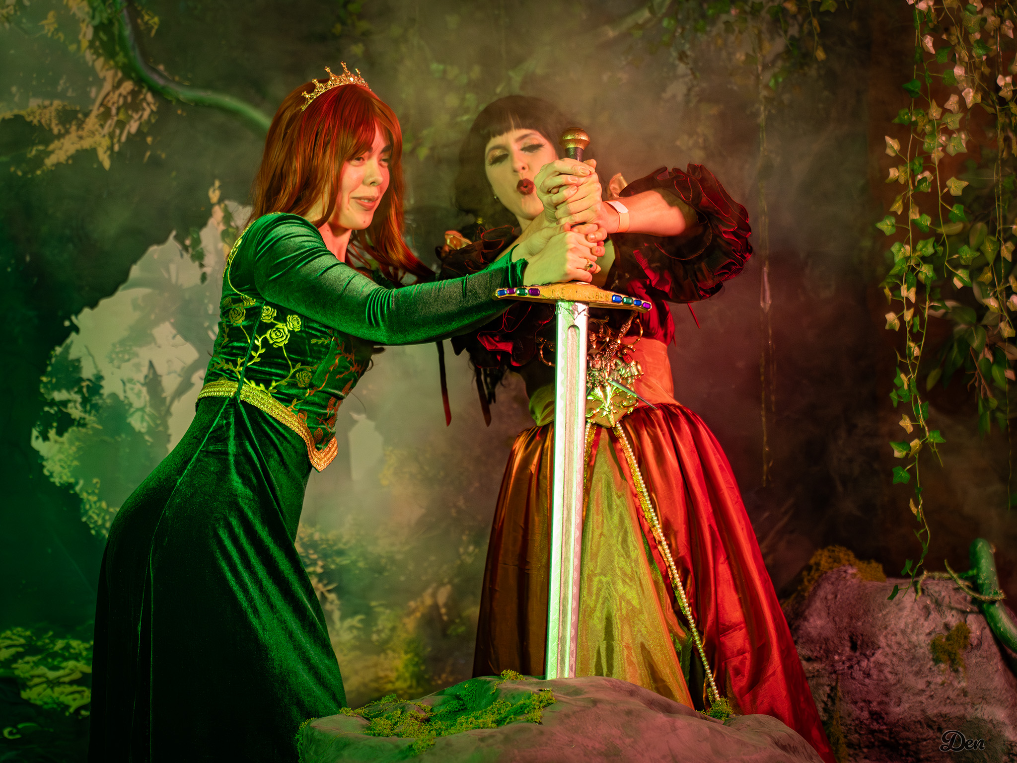 Two Knights barge through the crowd and start a sword fight behind the pair, to music sounding a lot like Suicide’s Rocket USA.