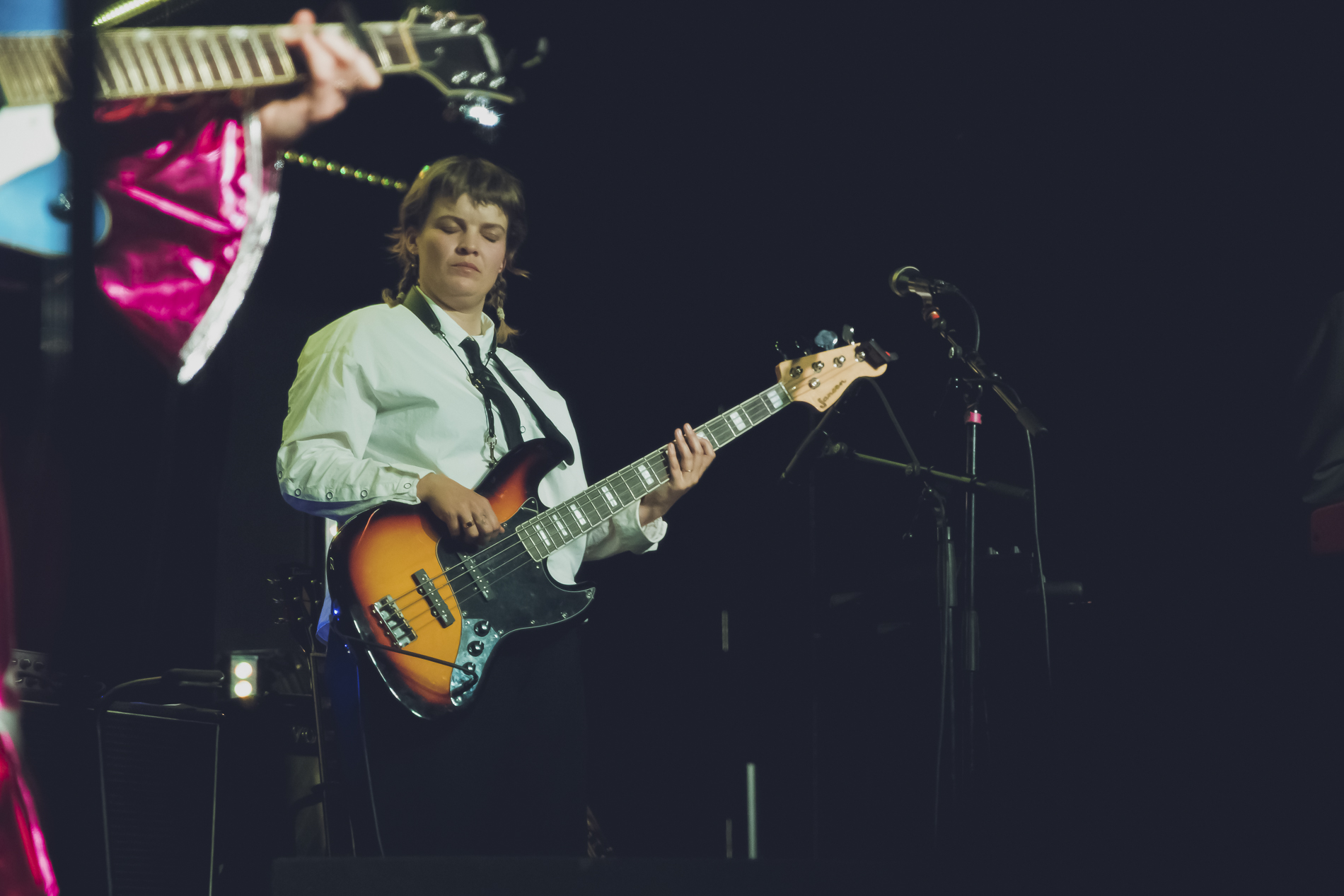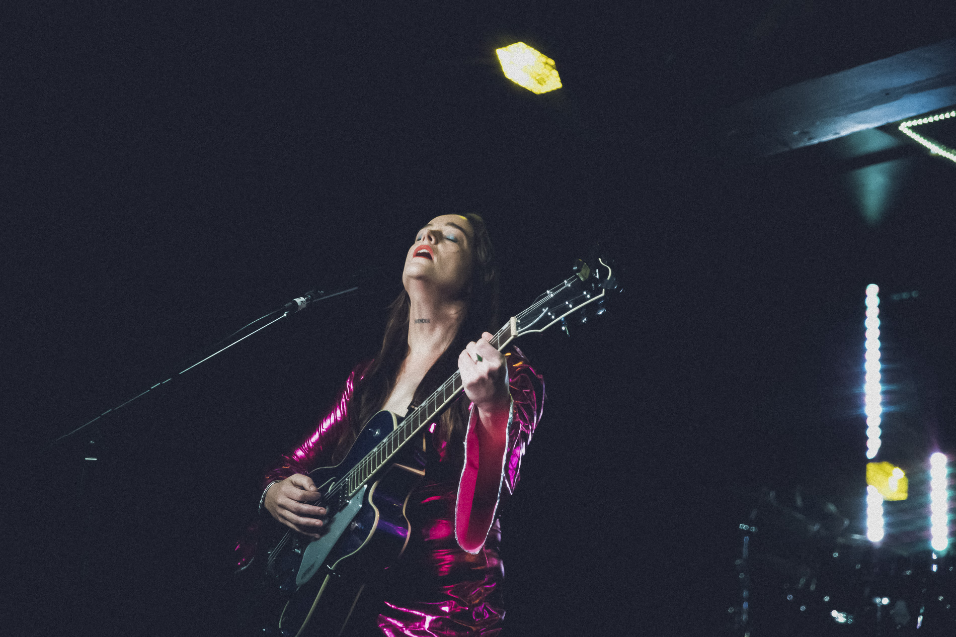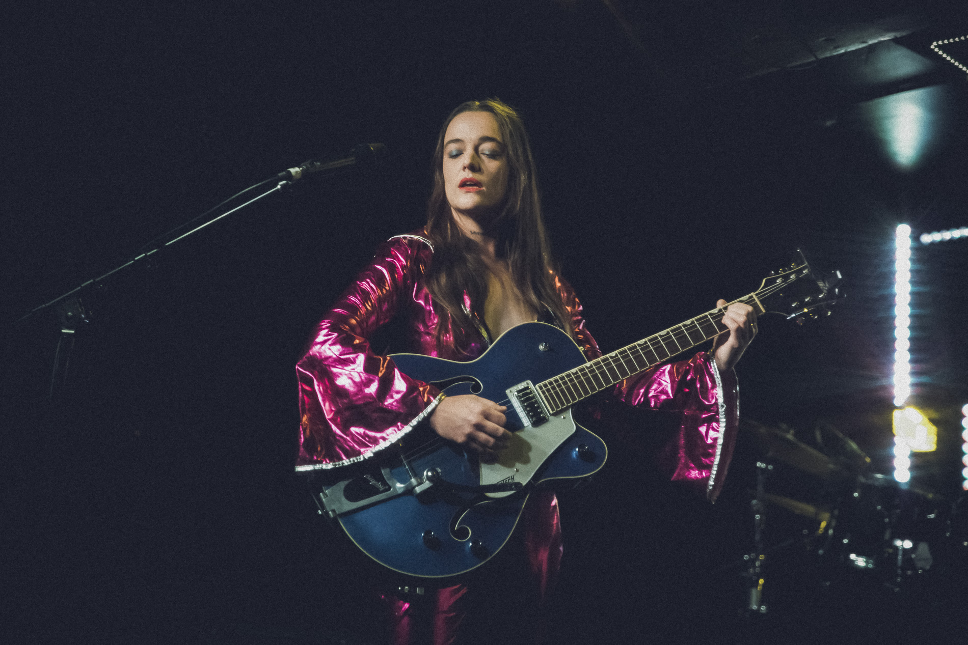 Jazmine is wearing a stunning bolero-style scarlet costume, and with their signature blue Gretsch guitar, they looks like a Latino mariachi Rock’n’roll mama like Wanda Jackson or Janis Martin.
