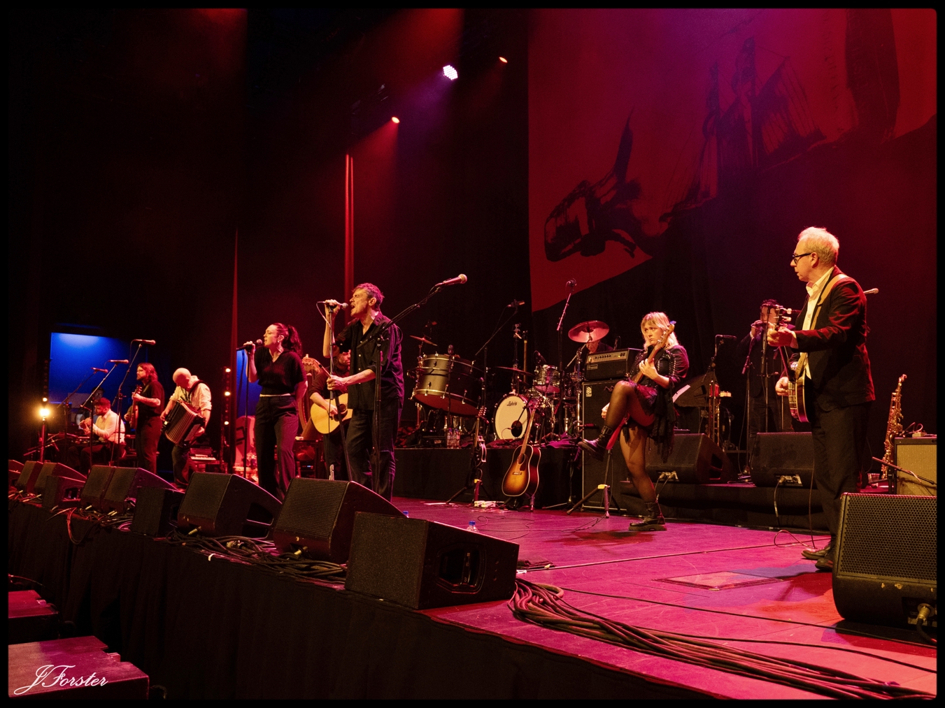 Original Pogues James Fearnley, Jem Finer, and Spider Stacy, were joined by Holly Mullineaux (bass), Jordan O’Leary (banjo), Fiachra Meek (pipes/whistles – Alfi), Jim Sclavunos (drums – Bad Seeds), plus a 3- piece brass section Pete Fraser, Daniel Hayes, and Ian Williamson. Taking turns at the mic were Daragh Lynch, Iona Zajac, Lisa O’Neill, and John Francis Flynn along with Spider Stacy.